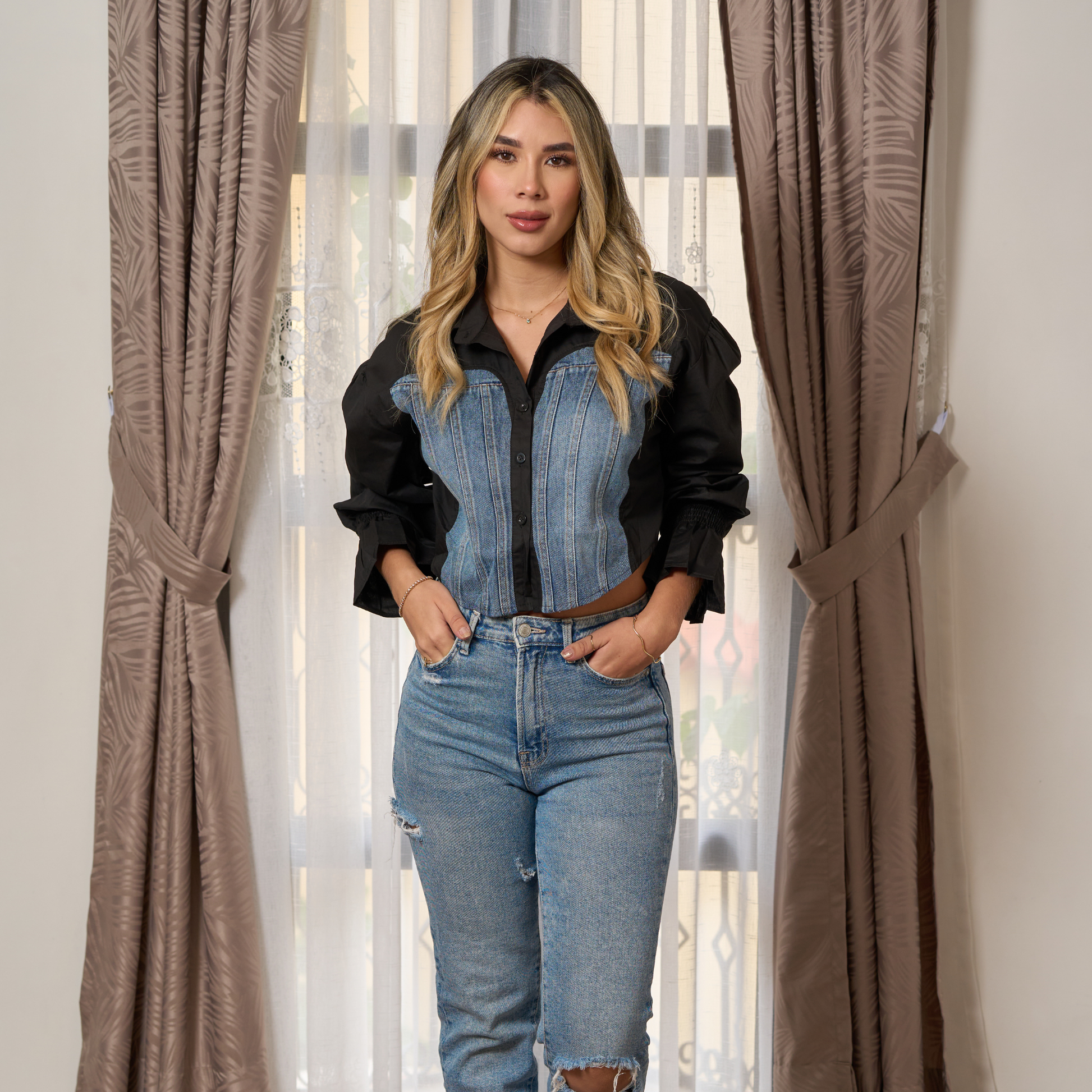La Camisera San Diego representa la perfecta interpretación de las tendencias actuales con un toque de distinción contemporánea. Esta pieza importada combina estratégicamente algodón-poliéster de alta calidad con apliques en denim, creando un contraste textural sofisticado que define el estilo urbano moderno. Sus mangas bombacha —la silueta trending de la temporada— añaden ese toque fashion-forward que transforma una prenda clásica en una pieza statement de alto impacto.