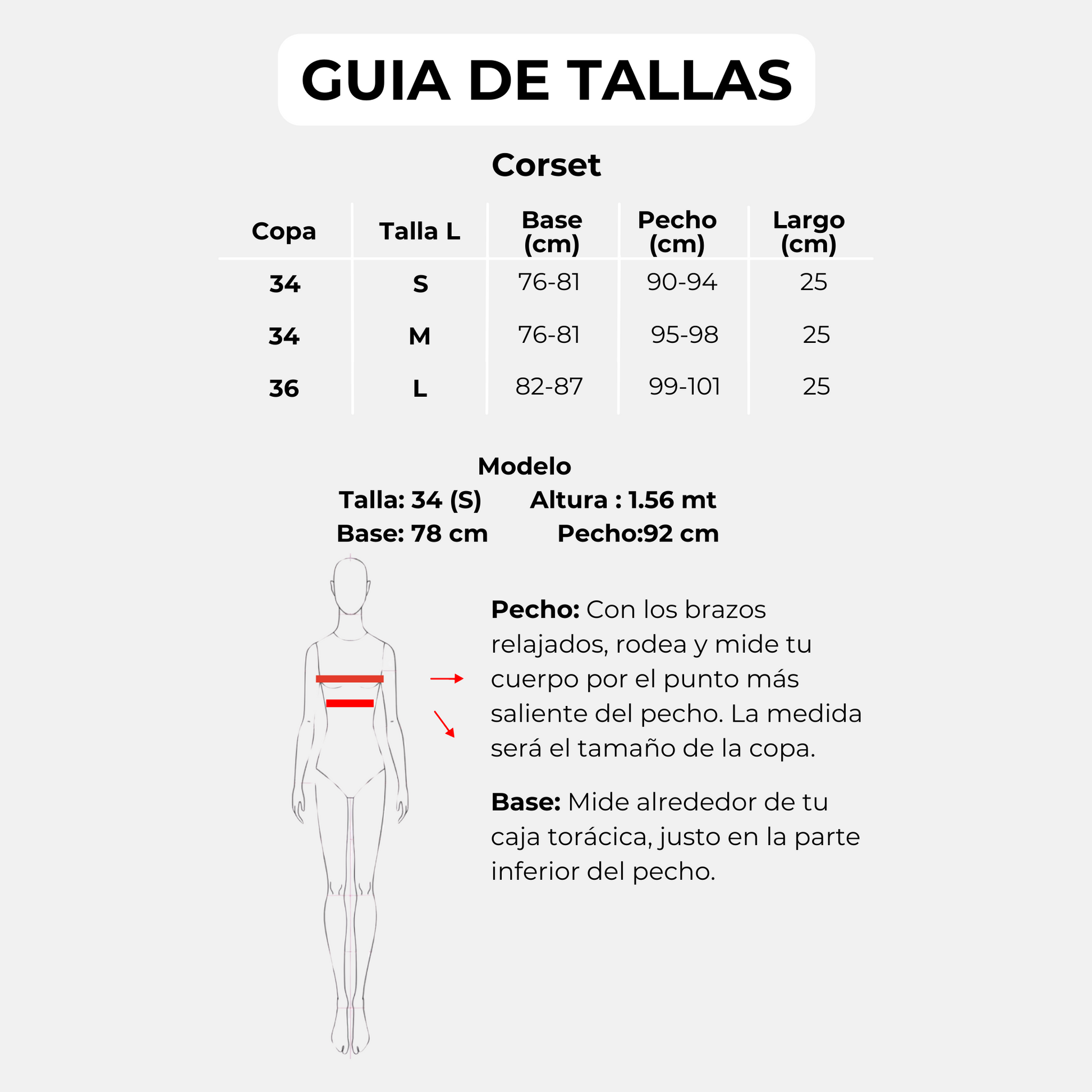 Corset Importado, tiras ajustables, realce de busto, cuatro niveles de ajuste, ocho broches por nivel, fusionado (doble tela), varillas que definen la figura.